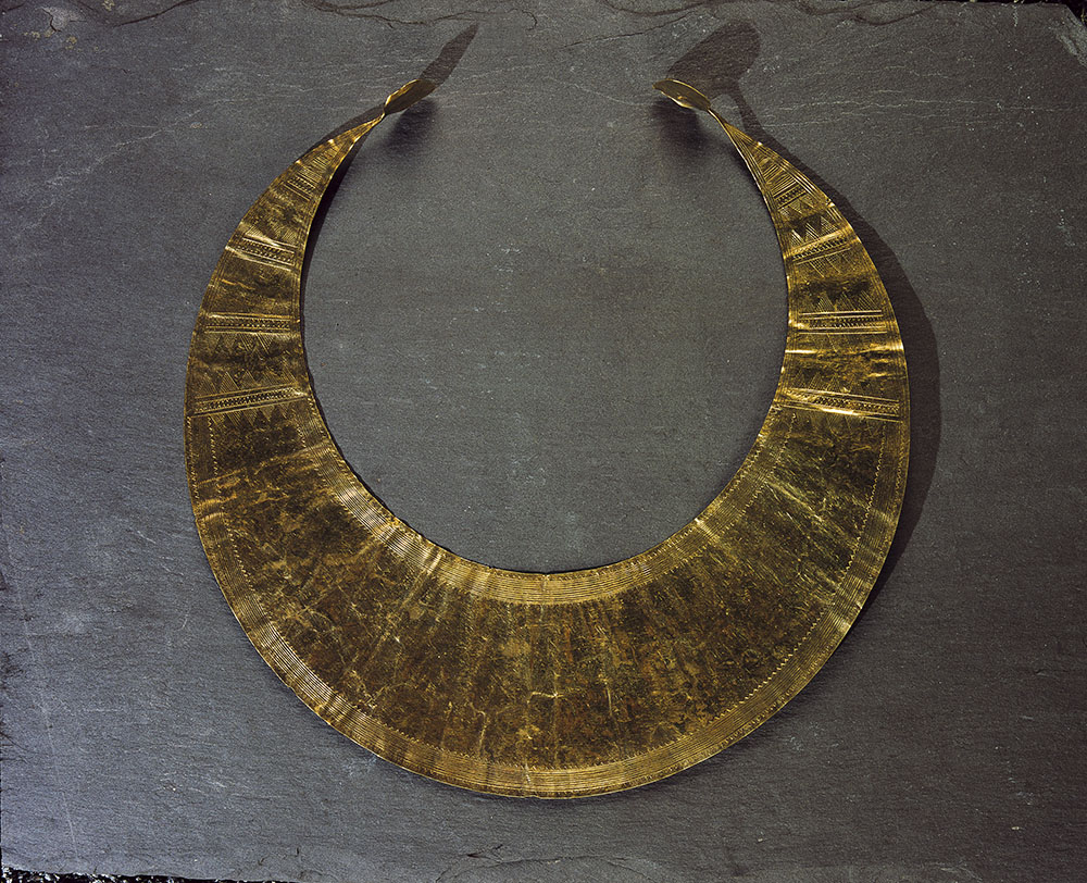 The way that gold is worked is very similar to silver, and requires the same general toolkit. For the sake of bypassing redundancy, I am going to forego describing goldsmithing in general, and instead use the example of Bronze Age lunulae. Lunulae are flattened gold necklaces in a crescent shape that have been found in Western Europe, with 80 of the some 100 lunulae having been found in Ireland. (National Museum of Ireland) They actually are the most prominent of gold objects found in early Bronze Age Ireland. Despite their crescent-like shape and the name itself, lunulae have been linked to sun worship as opposed to the moon and have often been incised by some sort of tool to create geometric shapes or linework.